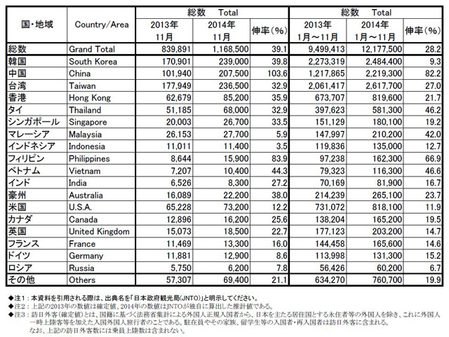 Read more about 2014年11月訪日外客數統計。首11個月突破1,200萬人次,單月也破了同月最高記綠。 …