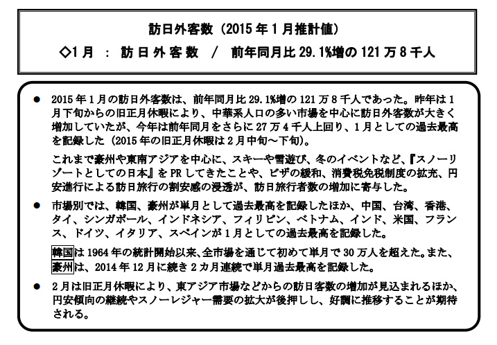 Read more about 2015年1月訪日外客數統計。單月錄得逾121萬人次,創有記錄以來同月最高,更首度有單一市場突破30萬人次! …