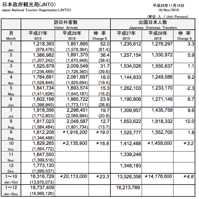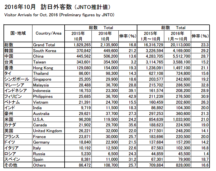 10月份是紅葉季節的正式開始,今個月的訪日旅客數也是一如預料般有不錯的成績,單月計有213萬人次,比去年同期升幅有16.8%,想當然是有記錄以來最高的10月份,而且更是繼今年7月以來排名所有月份的第2位。另一重點是,以月份計,截至10月份,旅客總數已突破2000萬人次了。