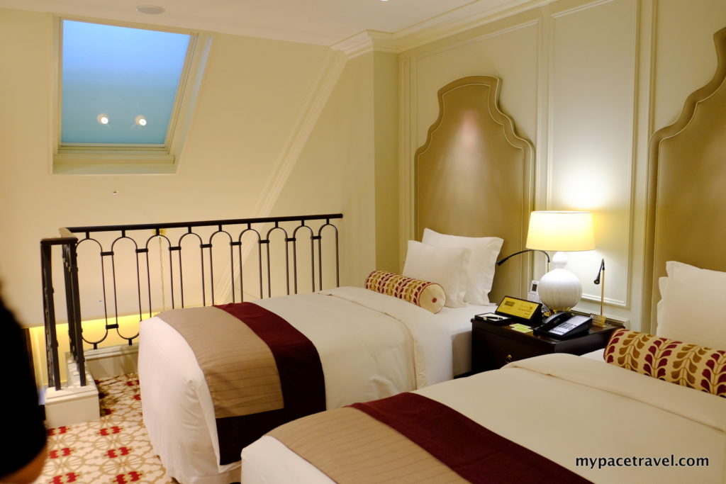 飯店樓高4層,地下是大堂及CAFE,2至4樓都是住客專用的客室及LOUNGE、大浴場部分,共有150間客房,房型選擇也很多元化,房間面積由23平方米起,至逾130米的高級大套房不等,今次我就到了飯店內最受情侶歡迎亦最有特色的メゾネットツイン房型參觀,這是東京都有極罕有的雙層式套房,兩層加起來的總面積是65平方米,地下入口層是客廳及浴室部分,沿樓梯而上則是寢室部分,另外還有大型的衣帽間等,除了雙床房外也有提供KING SIZE大床的房型,更適合情侶選擇啦,而且複式的設計更添華麗的氣氛,雖然有時候要走上走下是有點費力氣的,哈哈。