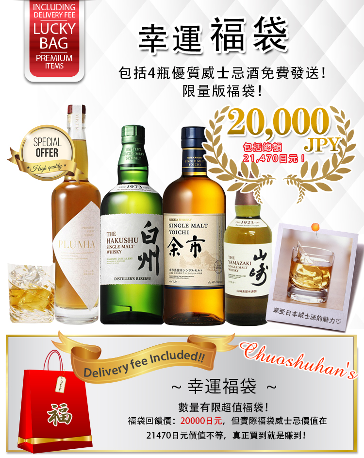 既然有送酒小食物,當然還要有酒啦。這是由chuoshuhan推出的威士忌套裝,售價是20,000円,套裝包括4支日本威士忌,700ML的白州及余市各1支,180ML的山崎1支,以及720ML的PLUMIA梅酒威士忌1支,平常散買的話要近22,000円,現在只賣20,000円,加上免運費,還可以用2,000円的優惠券,節省了不少。