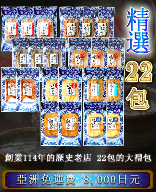 我一直都是小島食品的支持者,已經光顧過幾次了,他們的各款海鮮零食真的超好吃,送酒更是一流絕品!今次的這個是「海鮮零食精選22包」,共有9款經典人氣口味,售價是8,000円,平均每包售價不用400円,便宜。可使用1,000円的優惠券。