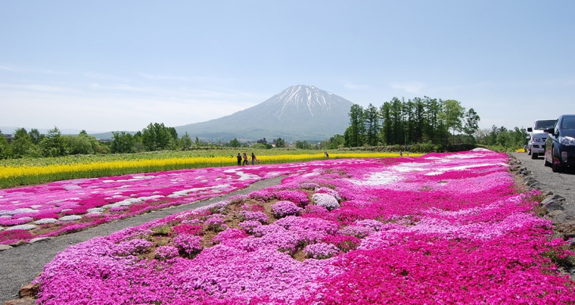 「三島さんの芝ざくら庭園」並不是由政府規劃的公園設施,總面積大概有4,000平方米,特色是公園的背景就是優美的蝦夷富士,而且芝櫻開花期間也是油菜花開花之期。