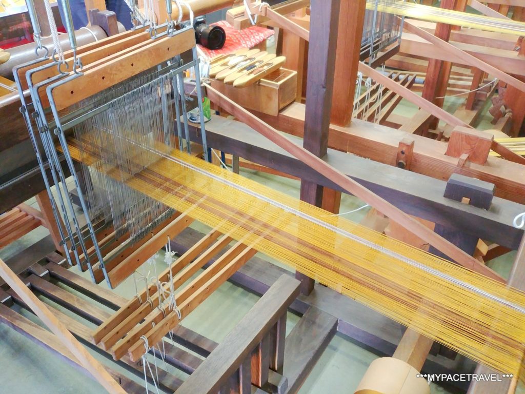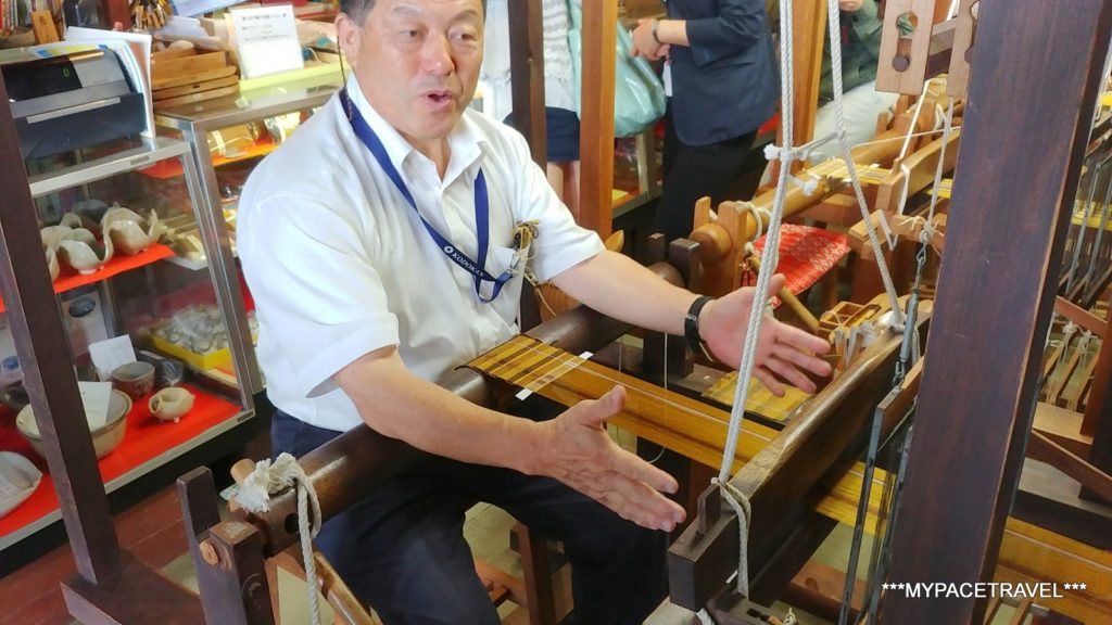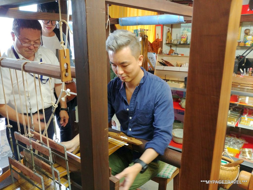 來這裡最主要就是可以親自體驗到黃八丈的製作,先由職員示範這些傳統織機如何運作。