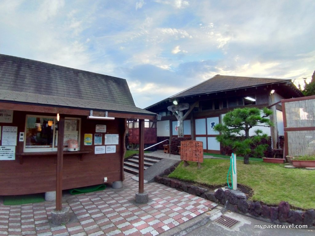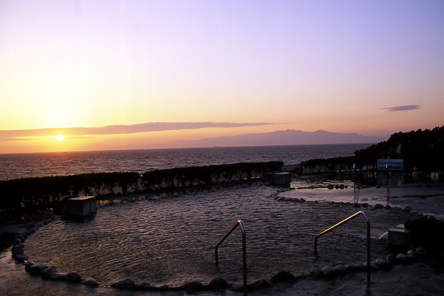 在元町港碼頭附近有兩個公用溫泉,一個叫「御神火溫泉」,是較大型的溫泉會館,而另一個就是這個「元町 浜の湯」,位處海邊,賣點是無敵大海景的露天風呂,座向跟單車道路一樣,所以可以一邊浸浴,一邊觀看日落勝景。露天風呂是男女混浴,可以穿著泳衣入浴。入場費300円,溫泉可以提供免費泳衣借出服務。