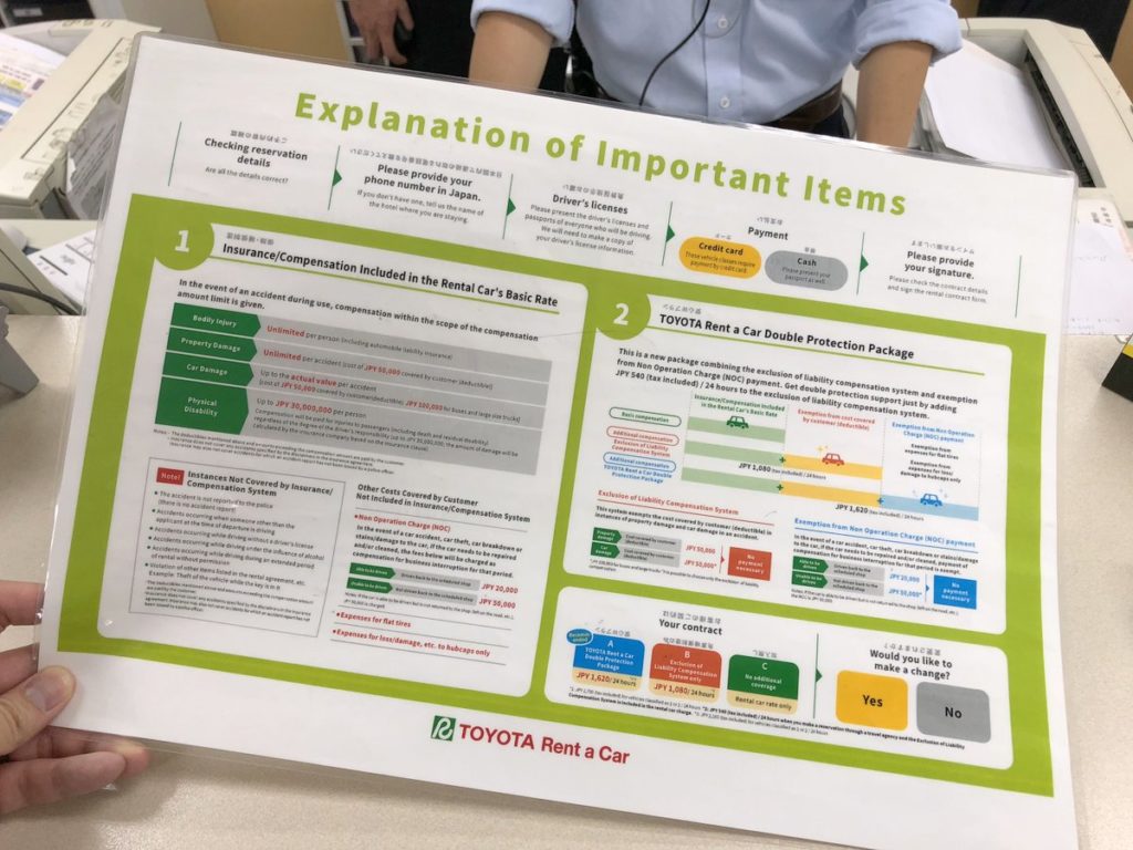 以TOYOTA RENT A CAR來說,即是「租車安心W」的保險制度,保險費用為每天1620円,比免責補償制度貴了540円,主要不同就是加入了免除營業損失賠償(NOC),簡單來說就是免除了如果發生事故時對物賠償、車輛賠償等顧客自負額,以上各項如果沒有加入上述保障制度,客人的負擔額是每項最多50000円的,加入了就可以免除了這可能高達100000円的賠償額了。其實說了那麼多,就是兩個字:安心。