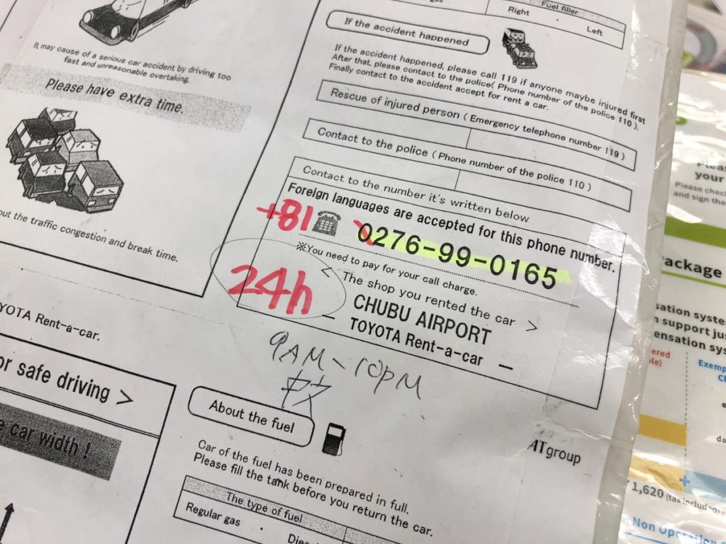 TOYOTA RENT A CAR在中部空港內就有分店,入境後穿過去鐵道大樓再依指示來到鐵道高架下便會見到,絕對不難找。這間分店有能說英語的職員,而且他們也常常接待來自外國的客人,基本溝通沒有問題。而租車當然要帶備三寶:護照、國際車牌(台灣車牌+譯本)及信用卡。辦完手續後就去取車,這是很重要的一部分,因為要跟職員確定車身上的花痕或輕微破損部分並要記錄在案,否則如果是回程還車時才發現的,就會當作是客人所造成的了。