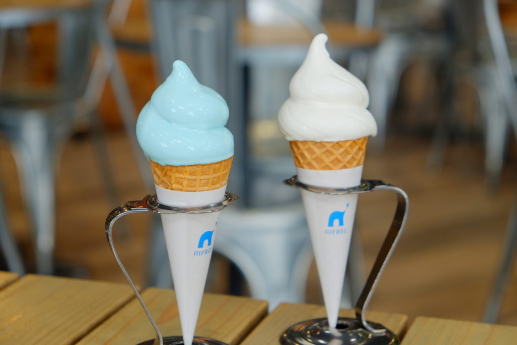 水滴形狀的軟雪糕也是很受歡迎,分別有波子汽水及香草味,各售350円。