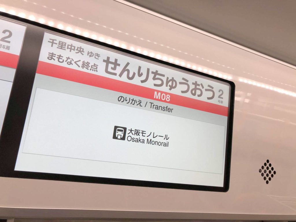 如果是乘坐御堂筋線直通千里中央的車両,在車廂內便有顯示目的地為千里中央,以及是轉悉乘大阪單軌的車站。