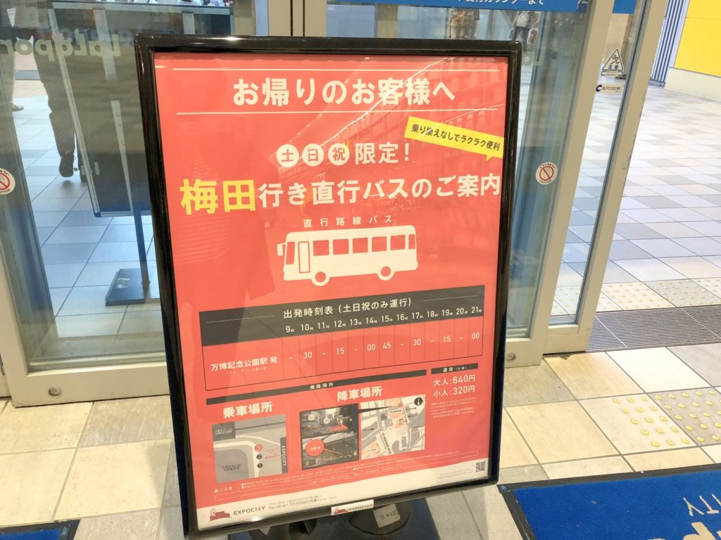 另外,除了電車外也可以選擇乘坐直行巴士,但就只限周六、日及假日才有運行,而車費則跟在梅田乘坐電車(御堂筋線+大阪單軌)的相若。