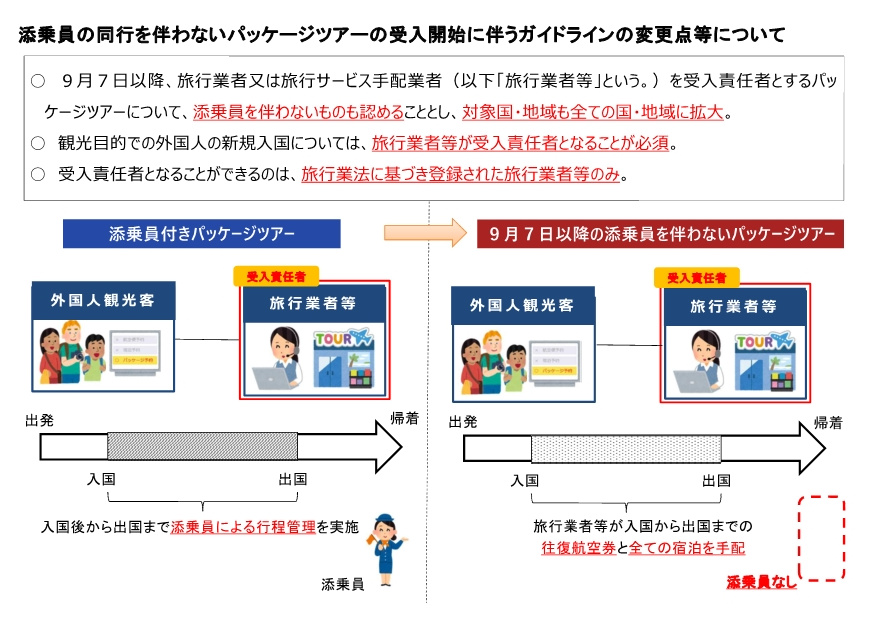 觀光客入境:9月7日起可接受經旅行社購買「添乗員の同行を伴わないパッケージツアー」,詳情請向上方GUIDELINE重點內容。