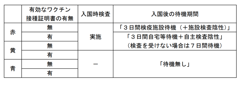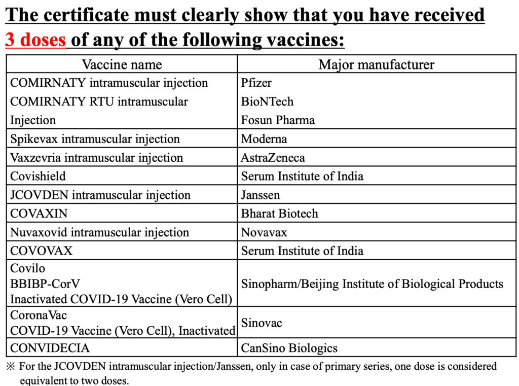 所有入境者唯一要求提交的是3回疫苗接種証明書,可接受疫苗為世衛通過可緊急使用疫苗名單內。如根據該名單,香港提供接種的復必泰及科興都是在名單之內,但台灣認可的多種疫苗中,高端疫苗現時仍未在名單內。(10月4日更新:厚生勞動省已更新可接受疫苗清單,日本政府之前不許可的科興疫苗是在名單之內)如未能提交証明書,也可以用72小時內的PCR檢測陰性証明書取代。