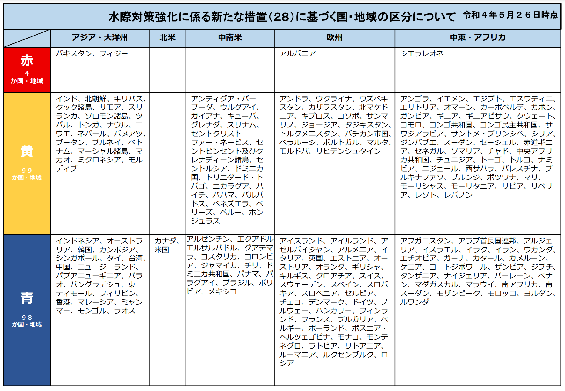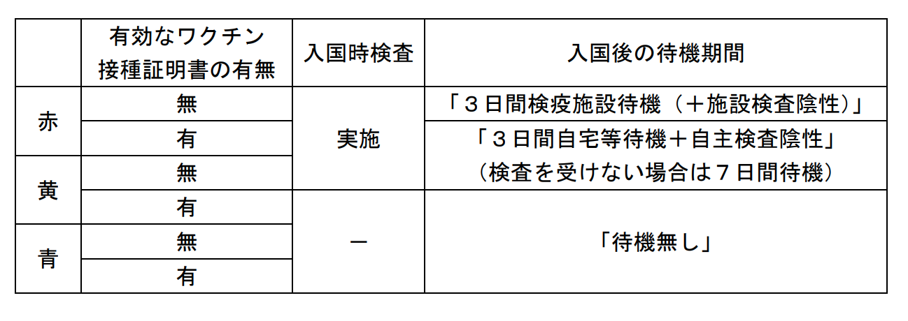 入境檢疫及隔離:由2022年6月1日起,日本依不同國家的防疫及疫苗普及等劃分為3等別:藍、黃及紅,來自藍色國家及地區的入境者,入境日本後不用提供疫苗証明、在機場接受病毒檢查亦不用隔離,入國後亦沒有其他限制(觀光客外);香港、台灣、新加坡、馬來西亞及中國等都被列為藍色。澳門則為黃色,入境時需要提供有效疫苗証明。