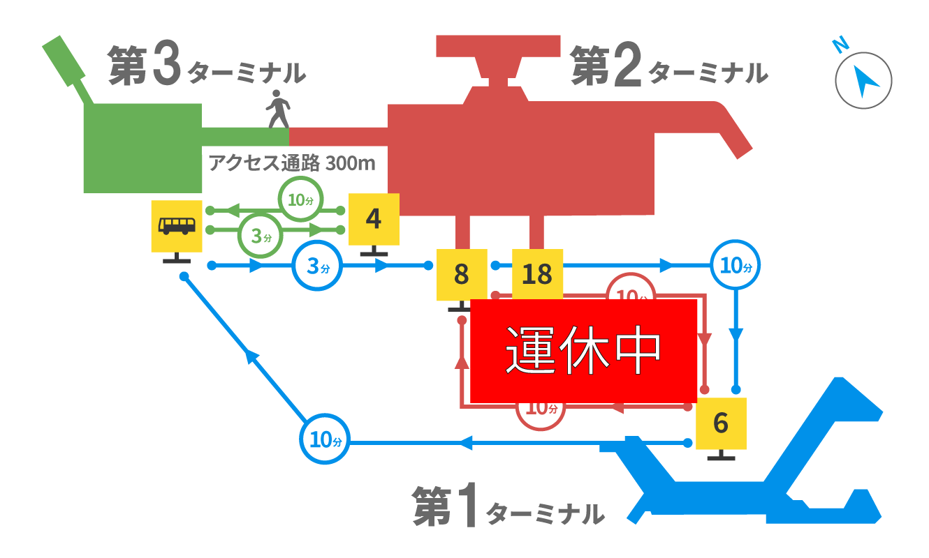 成田空港現時共有3個航廈:第1航廈、第2航廈 及 第3航廈,第1及第2之間並不相通,要往來這2個航廈必須乘坐免費接駁巴士(藍色線),該巴士是以循環模式往來全部3個航廈;而廉航專用的第3航廈早前已完成擴張及改建,可直接利用專用通道前往第2航廈,也可以乘坐免費接駁巴士(綠色線),該巴士僅往來第2及第3航廈之間。