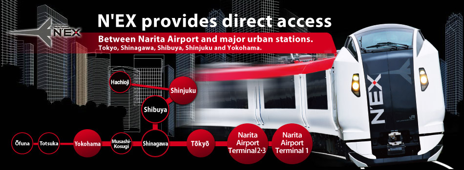 由JR東日本提供的成田空港特急車「NARITA EXPRESS」,應該是最多人認識的成田空港線電車,路線是由第1航廈的「成田空港駅」經第2航廈的「空港第2ビル」前往首都圈,現時已基本回復之前的班次水平,由成田空港出發共有2個目的地路線,包括神奈川的大船,以及東京的八王子,2條路線都會經過東京駅及品川駅,之後大船方向列車會前往橫濱再到大船,而八王子方向列車則會到澀谷、新宿再到八王子。