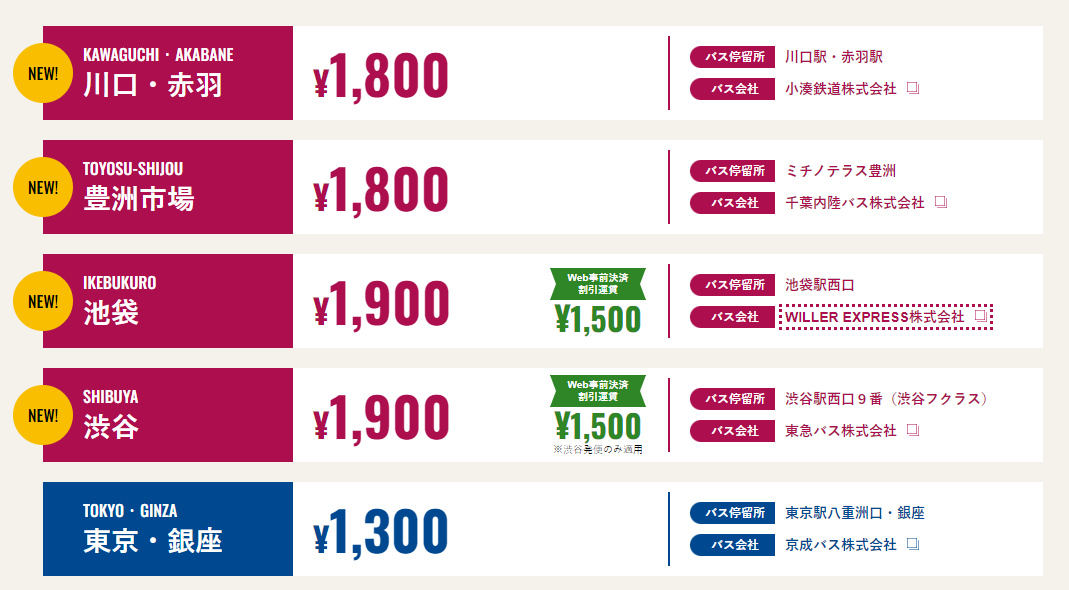 現時共有5條路線,分別是:川口線、豊洲市場線、池袋線、渋谷線 及 東京銀座線。留意要預約必須前往不同巴士公司官網,而與Airport Limousine相同,要留意東京市區繁忙時間以及高速公路也會在塞車情況,請預留足夠時間。
