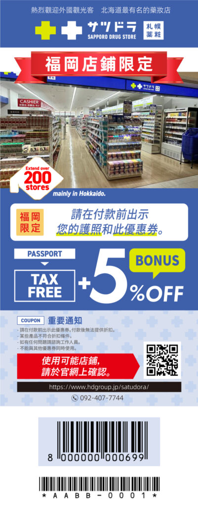 這張是僅限「札幌藥妝(サツドラ)福岡店」可以使用的購物優惠券,因為札幌藥妝認為福岡店非常適合遊客光顧,所以特別為這店推出優惠券,希望吸引大家到此店購買各款藥妝啦,而這間店也的確是蠻好逛的啦。