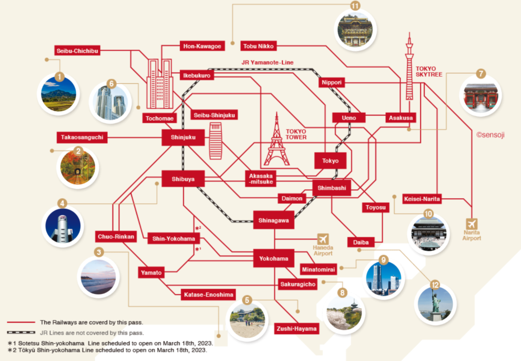 當中鐵道部分,適用區域為以下13家鐵路及軌道線全線區域:小田急線全線、京王線全線、京成線全線、京急線全線、相鐵線全線、西武線全線、東急線全線、東京 Metro 地鐵全線、都營地鐵全線、東京櫻花路面電車(都電荒川線)、日暮里-舍人線、東武線全線、港未來線、橫濱市營地鐵全線、百合海鷗線,留意有部分路線如京成線部分路段等不適用,而收費特快車及指定席等也要另外付費。
