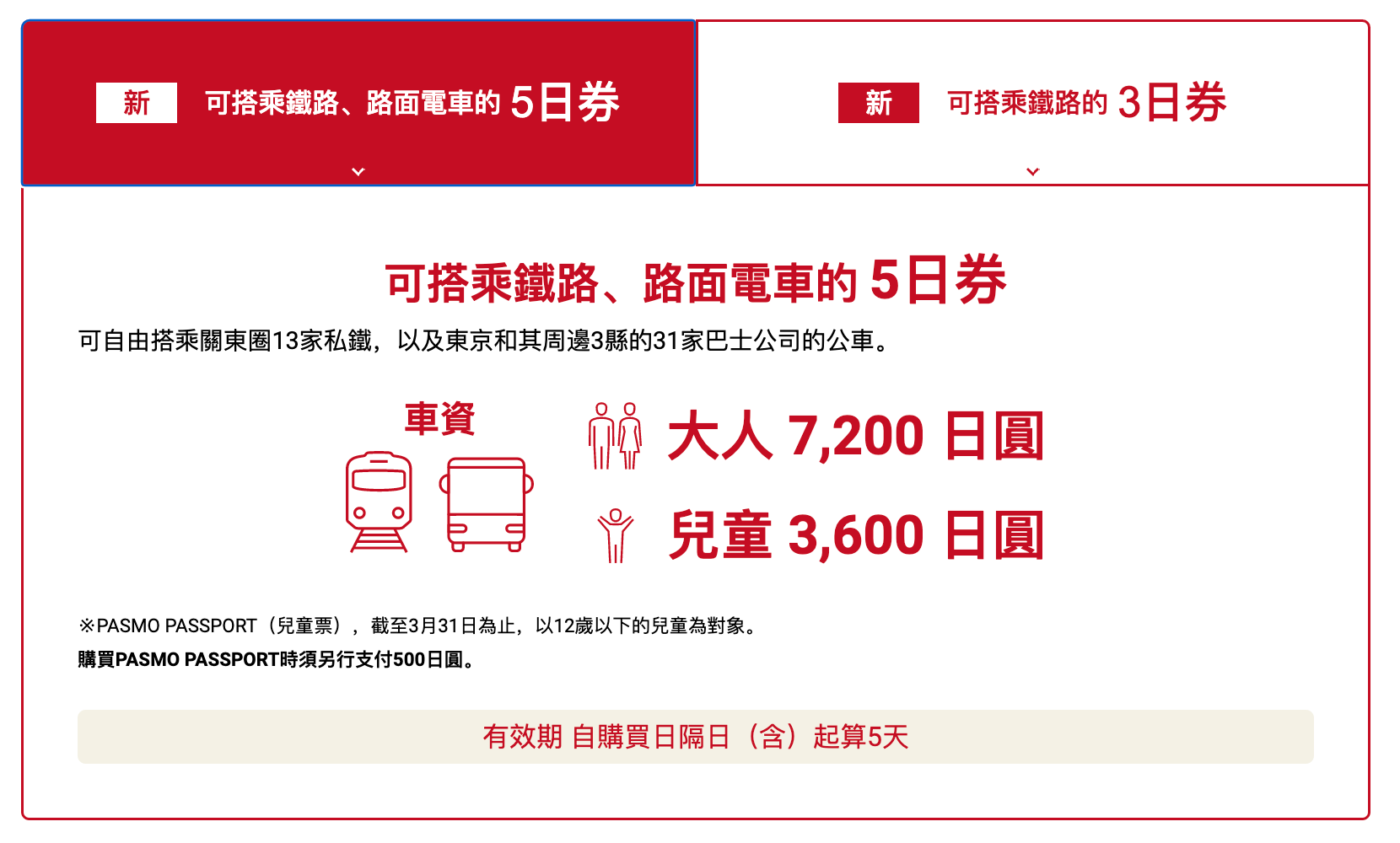 有效期是5日或3日,必須連續使用,而且是以日數即終電/尾班車計,而不是像地鐵券那樣以小時計,記緊不要搞亂。