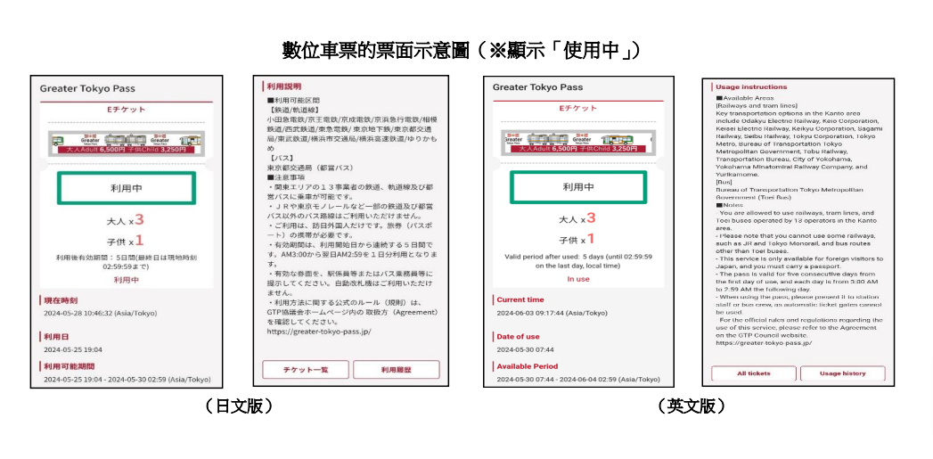 而由於為電子版票券,使用的方式也有改變,乘坐鐵路的話,請在有人閘口向工作人員出示「Greater Tokyo Pass」的主畫面,畫面上須為顯示「利用中」及利用日及有效期等資料,而乘坐巴士的話,就是向司機出示同一個畫面。