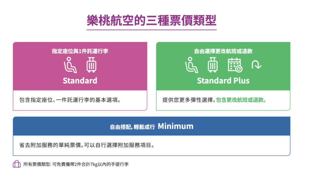 樂桃航空全新三種票價「Minimum、Standard及Standard Plus」類型,將於今年10月27日起引入,將完全取代現行票種,國際線及國內線同時適用。