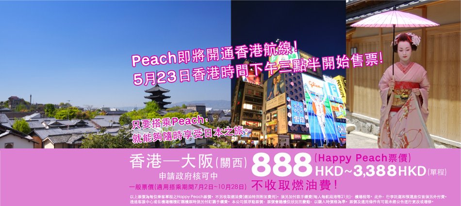 Read more about 緊急通知!桃子航空香港往來大阪關西線機票,今日(25/3)下午3時半正式開賣,單程由HK$888起。 …