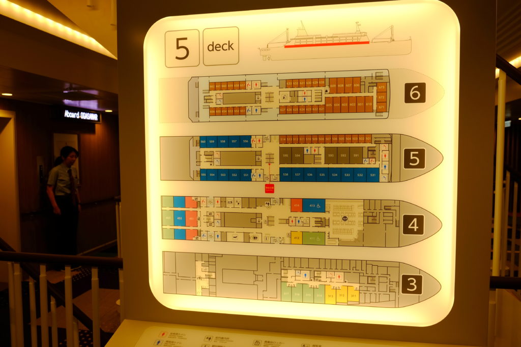 由於這只不過是一艘客船,並不是一艘郵輪,所以船上的設施是蠻基本的,主要活動的船艙共有6層,包括有各種不同等級的客室、賣店、餐廳、休息室、酒吧以及開放給公眾的觀景露台及甲板等,另外每層也有多個洗手間,可以滿足全船最多近900位旅客的基本需要啦。