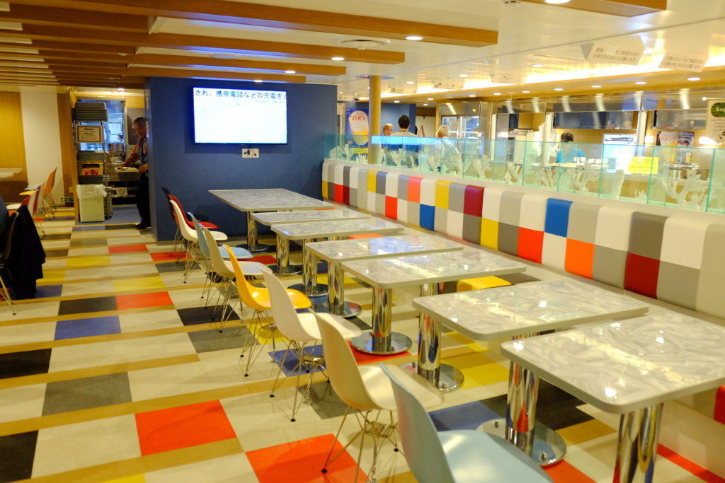船上的餐廳提供早午晚餐服務,菜色的選擇其實也蠻多的,所以應該不會吃到悶吧?另外酒吧那裡除了有酒供應外,也有一些小吃等提供,留意兩者也不是24小時營業,如果半夜想找點吃的話,可以到自助購物LOUNGE,那裡除了有飲品售賣機外,也有杯麵及熱食售賣機的,另外,在賣店那裡也可以買到杯麵及麵包等(也不是24小時的啊),而且重點是,價錢其實跟在東京市內的,沒有太大分別,良心啊。