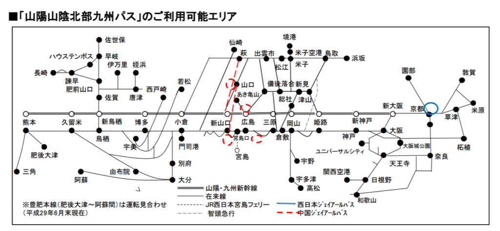 而可用範圍方面,基本上就是將現時JR西日本的「山陽&山陰地區鐵路周遊券」,以及JR九州的「北部九州地區周遊券」合二為一,而可用的路線也是大致相同,主要範圍包括:關西至以東的敦賀及以南的和歌山、山陽地區全線、岡山經瀬戶內海線至高松、山陰的鳥取及山口地區(不包括京都北部及兵庫北部)、北九州的福岡、大分、長崎及熊本4縣。