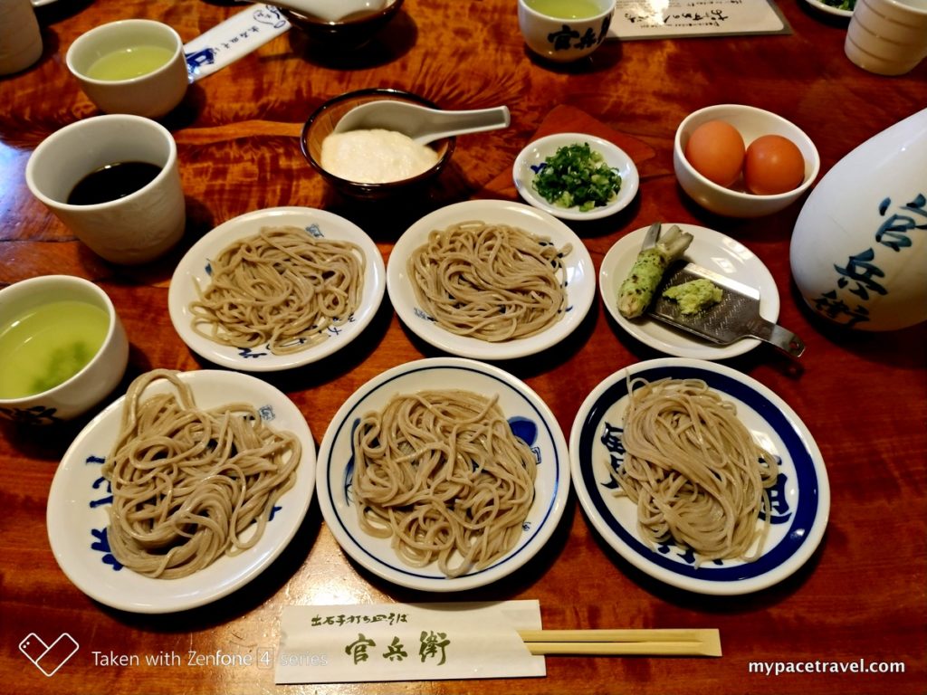 「出石皿そば」是出石町的名物,這裡有數百年的製蕎麥麵歷史,在這裡大概有50間上下的「出石皿そば」專門料理店,是關西最具規模的蕎麥麵集中地之一。「出石皿そば」跟一般的そば不同,「出石皿そば」是以小碟盛裝,這些小碟也一定是在地製作的出石焼,「出石皿そば」的套餐還會有提供雞蛋、山葵及山藥等作為そば汁的配料,而這個食法大概已有半個世紀以上的歷史了,而全日本也是只有這裡才有這個食法的啦,而每5碟的份量大概等於正常份量的1.5倍左右。