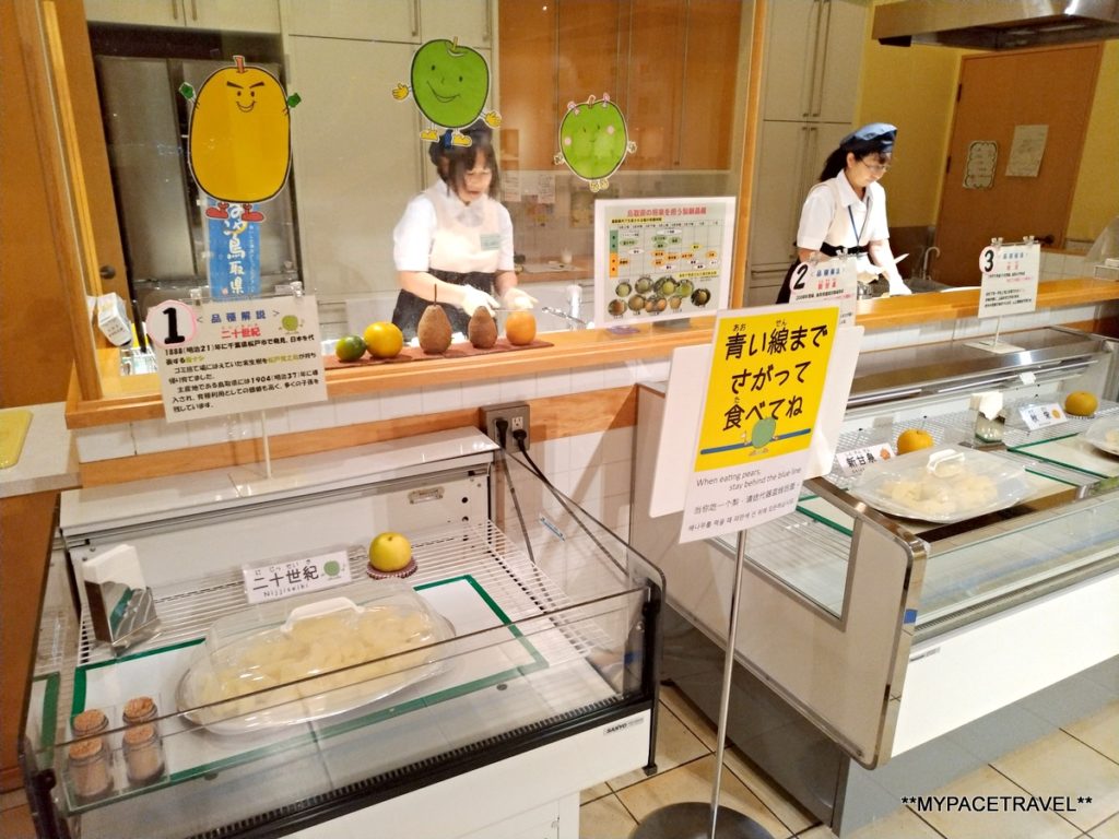 展品其實是蠻多元化也有趣的,就算不是對日本梨有特別研究也應該會感到興趣,另外在戶外展示區更有真正的日本梨子樹展示,而在出入口部分也有記念品售賣店及CAFE,售賣店有多款鳥取及倉吉的名物出售,也有大量日本梨相關手信,而且還可以整箱日本梨買走,CAFE則有供應多款日本梨口味甜點如軟雪糕等,值得一吃。當中重點就是可以在館內品嘗到不同品種的時令日本梨,常設基本上就有3款,再視不同的季節再加上期間限定的版本,平常是很少機會一次過試吃到及比併到不同品種的不同甜度及口感,試吃完後大家知道自己喜愛的是什麼口味,在離館前就可以在記念品店買到自己喜愛的日本梨啦。