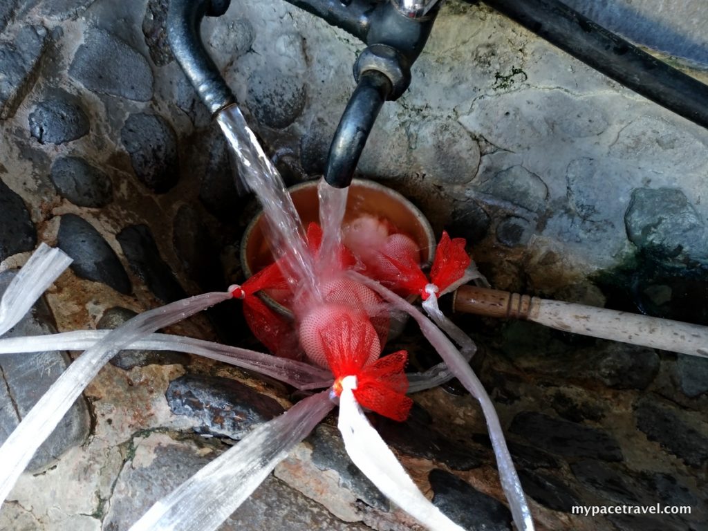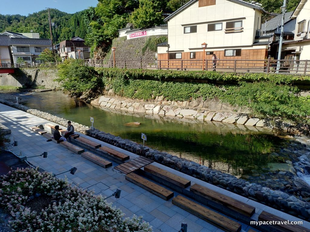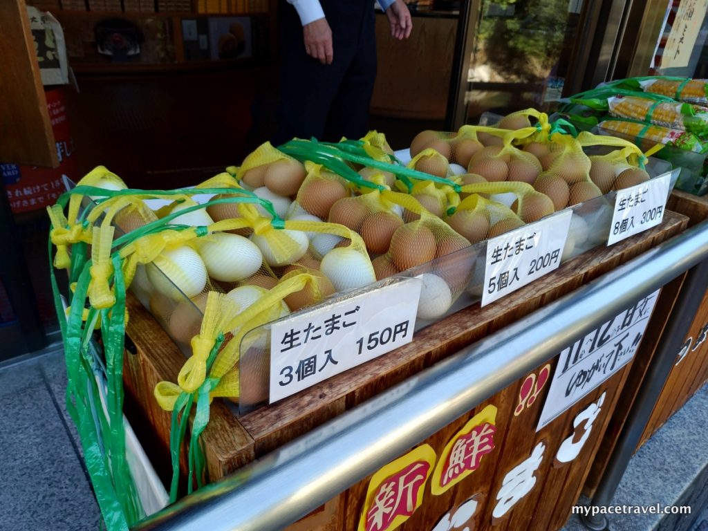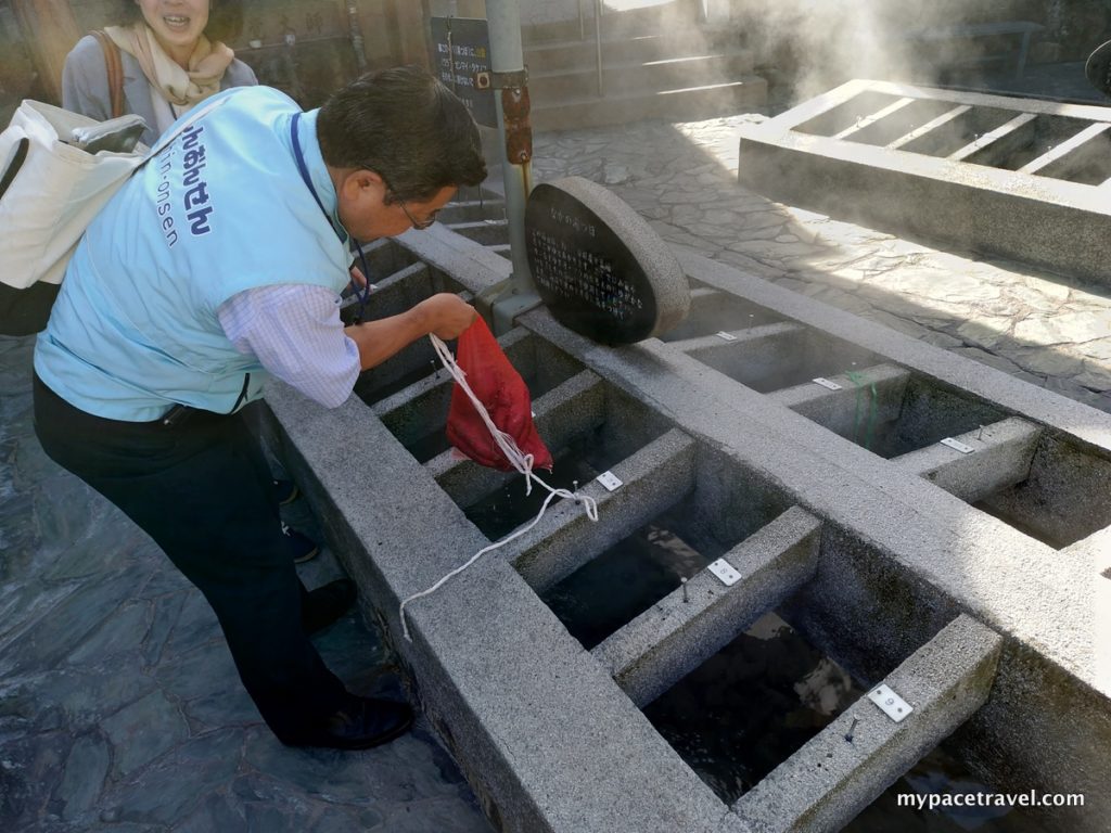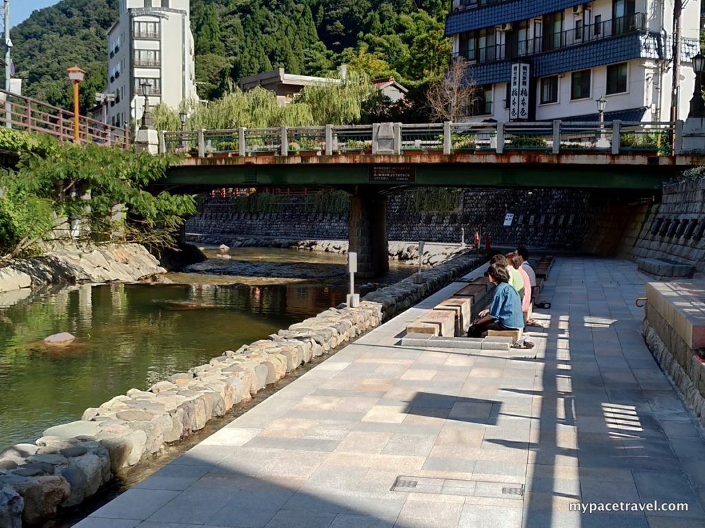 而湯村的正中心也有一個溫泉街,中央以河流作分隔兩旁也有不少店鋪及食肆,很有傳統溫泉街氣氛,而且重點是景色實在不錯,還可以在那裡享用免費足湯(荒湯で湯),也可以在附近的店鋪購買雞蛋(約150円/3個),直接在指定地方放入溫泉水泉湯內自製溫泉蛋,這是城崎也沒有的體驗啊。