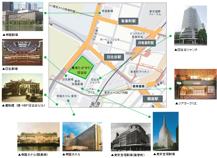「東京ミッドタウン日比谷」的所在地的前身是相鄰的「三信ビルディング」及「日比谷三井ビルディング」大廈,前者落成於1929年,後者則是50年代,兩者在2007年及2011年完成解體,三井不動産最後決定將兩者的地段合併重建,就成為了「東京ミッドタウン日比谷」的計劃。