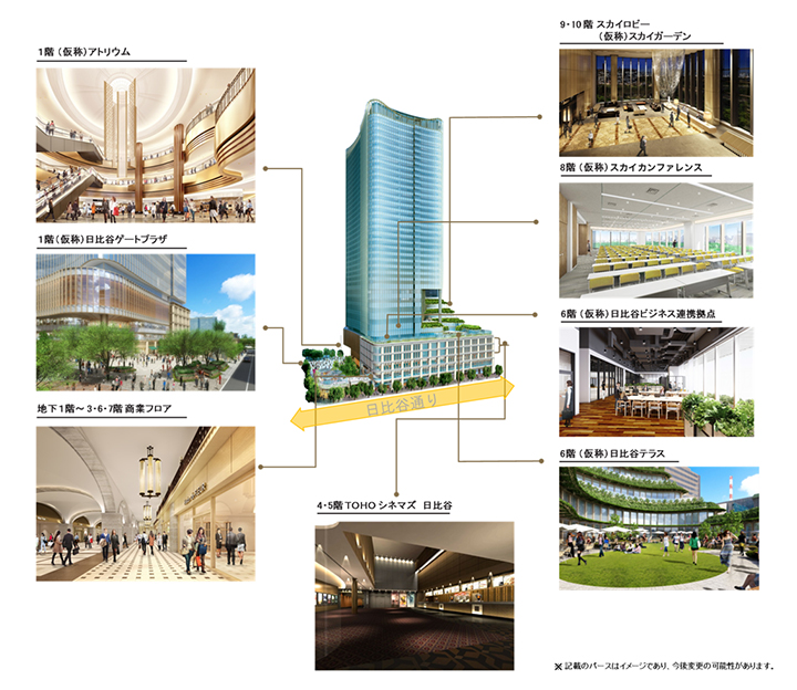 「東京ミッドタウン日比谷」與同系的「東京ミッドタウン」相同,也是超大型的複合施設,總樓面面積約189,000平方米,為地上35階及地下4階的設計,高層大樓為現代化辦公大樓,而商業設施則是由地下1階至地上7階,預計會有60間店鋪入居,當中包括有5間是日本初出店、14間是商業設施初出店,店鋪組合主要以中至高級消費品為主,當中的地下1階是高級超市型食街、3樓是飲食層、4至5樓則是TOHO電影院。