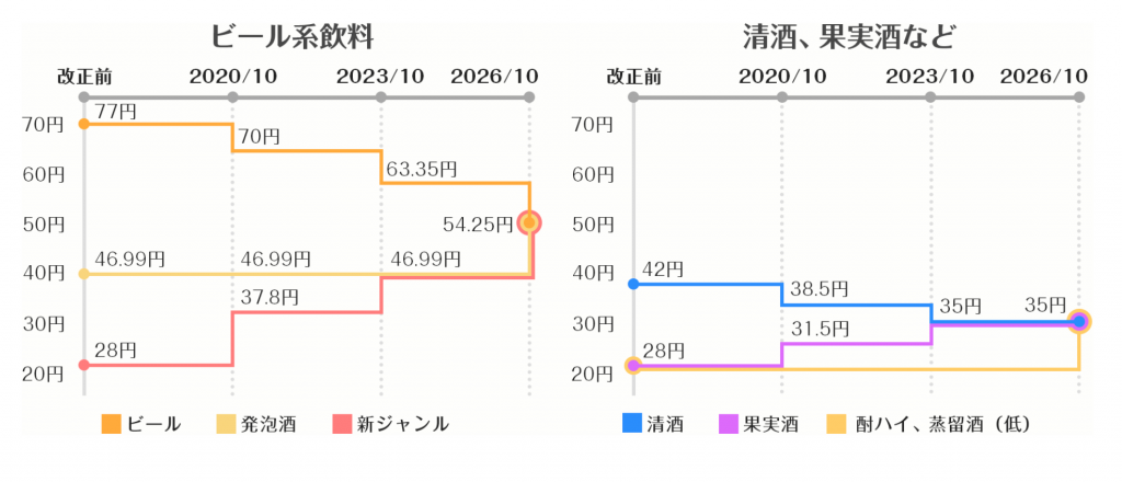 簡單來說,新的酒稅法改正的目標,就是將2大類酒類,第1類啤酒類,包括:啤酒、發泡酒及第3啤酒等 以及 第2類清酒及果實酒類,包括:清酒、果實酒及チューハイ等,由現時不同的稅金逐步改為劃一稅金,第1類為約55円,第2類為約35円。