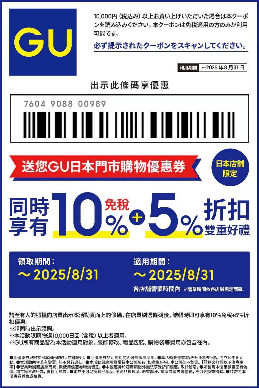 UNIQLO同集團的GU時裝店有多好逛相信也不用多說了,款色選擇多、時尚、價格實惠而且男女童裝齊備,不時推出的聯乘款更是潮流不二之選,極之受歡迎,除日本外,香港及台灣等地也有分店,同樣非常人氣!而今次跟大家分享的就是GU日本店限定優惠券,連同退稅10%可享合共15%優惠,現時日圓匯價仍然低迷,現在不瘋狂血拼還待何時呀!