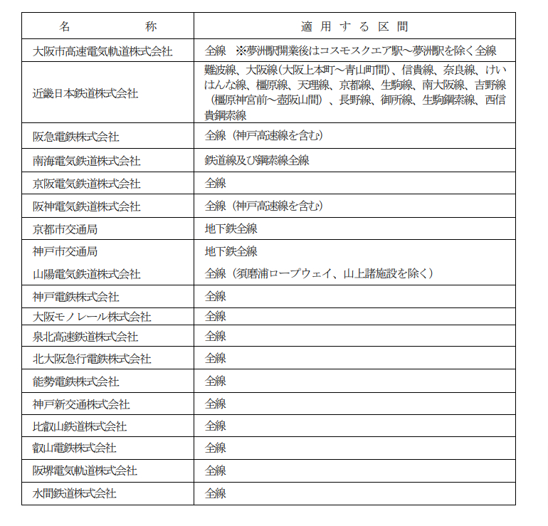 「KANSAI RAILWAY PASS」合共可利用的鐵道會社共19社,基本上涵蓋關西地區的大阪、和歌山、京都、奈良及神戶的主要景點,也包括關西空港,主要旅客會利用的:南海電気鉄道、阪急電鉄、近畿日本鉄道、京阪電気鉄道、阪神電気等也包括在內。但要留意的是,大阪地下鐵以及JR東海、JR西日本,也是跟「關西周遊卡(KTP)」相同是不能利用的。