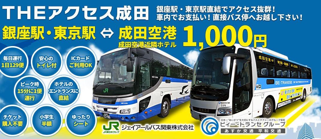 「THE アクセス成田」是由JR關東及平和交通等聯營的平價成田空港機場巴士,單程車費1,000円,往來成田空港至銀座/東京駅間,是另一便宜的空港往來市區交通之選。