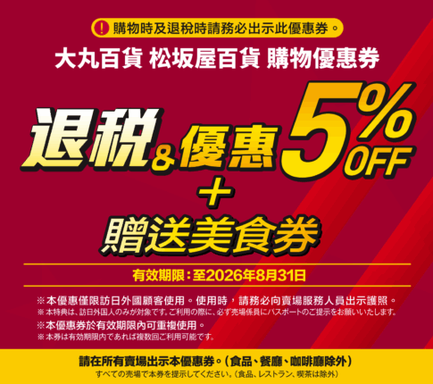 新COUPON到着!大丸松坂屋百貨優惠券! 大丸松坂屋百貨共10間大丸及松阪屋分店可用:大丸百貨(心齋橋店、梅田店、京都店、神戶店、東京店、札幌店、下關店),松坂屋百貨(名古屋店、上野店、靜岡店)